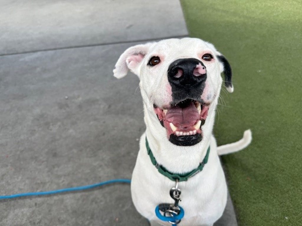 The shelter staff describes me as a white , neutered male American Pit Bull mixed breed. The shelter staff believes that I am approximately 2 years old.