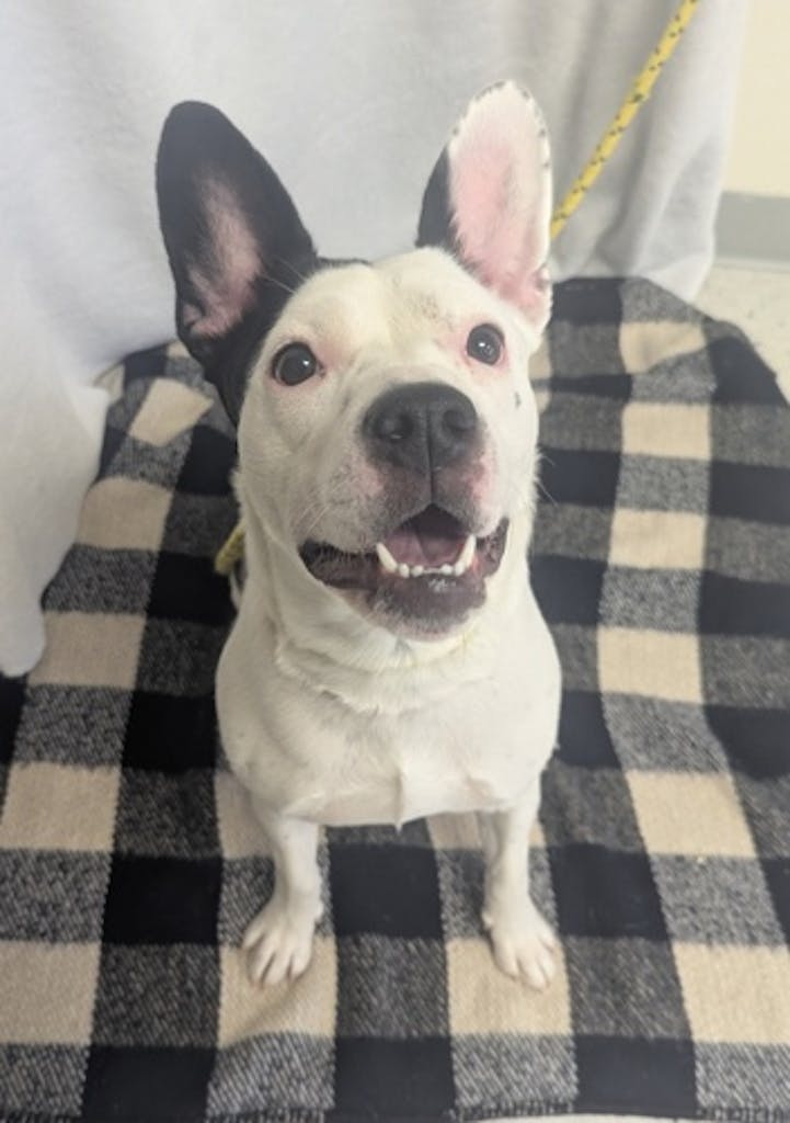 The shelter staff describes me as a white and Black , unspayed female American Pit Bull mixed breed. The shelter staff believes that I am approximately 2 years old.